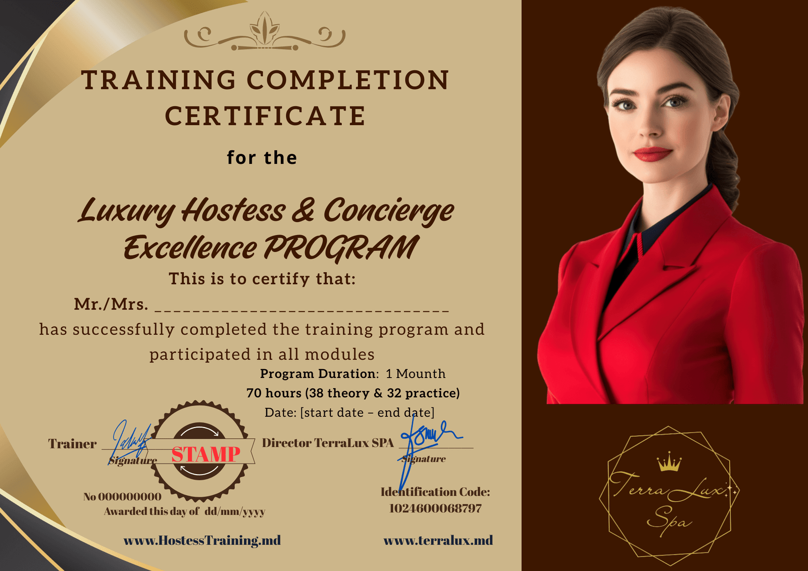 После успешного завершения программы каждый участник получает Certificate of Completion Luxury Hostess & Concierge Excellence, который отражает профессиональное совершенство, элитный стандарт обслуживания и соответствие boutique luxury hospitality.